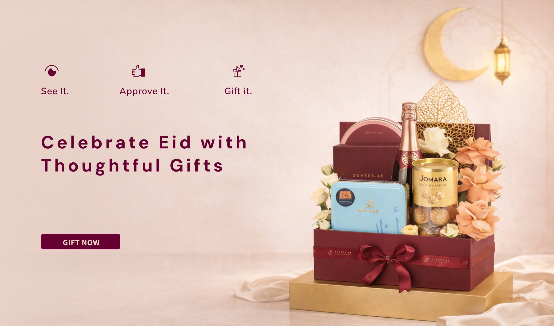 - Eid Gifts: Crescent Red Floral Gifts or Eid Mubarak Boxes with pink and white carnations, lavender, or vibrant rose bouquets; often paired with dates or chocolates for iftar or Eid al-Fitr celebrations.