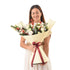 A luminous tribute to winter elegance — the Light of White Gold in Bouquet blends soft white blooms, frosted greens, and golden festive accents to create a bouquet that feels both serene and celebratory. Featuring 5 White Roses, 5 White Spray Roses, 4 Ilex Berry stems, 6 Vaccinium Snow stems, 4 Eucalyptus stems, ½ kg of Nobilis, and 12 Ruscus stems, this arrangement captures the purity and brightness of winter light. Decorative touches including 3 Cotton stems, 4 Golden Balls, and 4 Pine Cones add warmth, texture, and a gilded Christmas charm. Wrapped beautifully in 4 layers of Peach Wrapping and tied with a ZUVEES Signature Ribbon, it is a bouquet crafted to glow with sophistication and festive spirit.