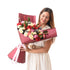 A captivating blend of winter elegance and romantic colour tones — the Midnight Rosabelle Bouquet brings together deep reds, soft purples, and warm peach shades for a striking festive arrangement. Featuring 6 Red Roses, 6 Purple Roses, 3 Pink Carnations, 5 Peach Spray Roses, 3 Ilex Berry stems, 3 Eucalyptus stems, 250g of Nobilis, and 8 Ruscus stems, this bouquet offers a lush, full, and beautifully layered winter composition. Decorative touches including 4 Silver Pine Cones add a frosted festive shimmer, elevating the bouquet with seasonal charm. Finished with premium signature wrapping and a ZUVEES Purple Ribbon, it is crafted to leave a lasting impression of beauty and celebration.