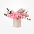 This delightful arrangement includes 9 pink carnations, 6 Esperance roses, 5 pink spray roses, 1 pink hydrangea, and eucalyptus, beautifully styled for a fresh, cheerful look.